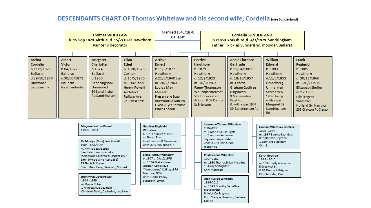 I need to recognise a primary source for this book as ‘The House of Whitelaw’ by H. Vincent Whitelaw published in 1928. I also acknowledge the extensive research conducted by my cousin Margaret Delane, her mother Beatrice (Betty) Fitzgerald, (nee Whitelaw) and our grandmother Evelyn Agnes Linda Whitelaw (nee Munro). Margaret has researched and written most of the chapters on the Ballarat Whitelaws, Thomas and Henry Albert.