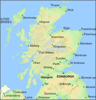 The country of Scotland is the northern-most part of the United Kingdom. It has a 154 km land border with England, and it is surrounded by the Atlantic Ocean to the north and west, the North Sea to the north-east and the Irish Sea to the south.