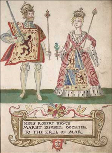 King Robert the Bruce (Robert I, 1274-1329) had a daughter Marjory Bruce (born in 1293) who married a Walter Stewart. His name was derived from a long line of ‘stewards’, who were officers that managed the domestic affairs of the royal households. One of their children, born in 1371 became the next king as Robert II. He was known as the First Sovereign of the House of Stewart (later changing to ‘Stuart’).